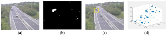 Illustration outlines for the LV datasets. Inconsistent occasions are featured by boxes. (a) Original image; (b) background subtraction frame; (c) abnormal event detected frame; and (d) 3D plot representation.