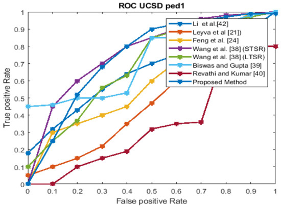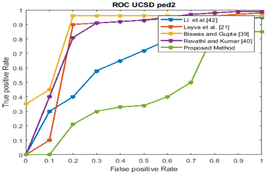 The performance estimation of the proposed strategy was computed in the form of the EER for the three datasets at frame level detection and compared with existing techniques. The existing approaches were modeled to improve the performance for an indoor environment, but the proposed approach used in this paper concentrated on the performance (accuracy, EER, and processing time) in unconstrained scenarios (dense crowds and complex scenes). The Receiver Operating Characteristics (ROC) curve indicates its precision in the form of its sensitivity. From the ROC curve, note that the anomaly identification of the proposed approach achieved a better result for the three datasets.