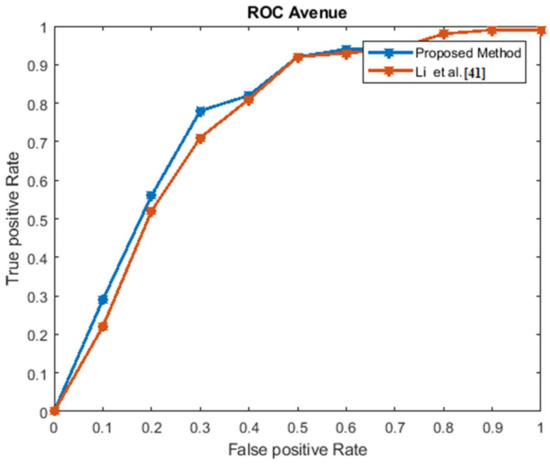 Figure 6, Figure 7, Figure 8 and Figure 9 show the ROC curves for the three datasets to measure the cut-off points in terms of sensitivity and specificity. The proposed approach achieved a competitive performance compared with the existing approaches in References [21,24,38,39,40,41].