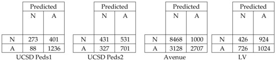 Figure 10 represents the confusion matrix for all datasets in terms of EER to show the classification performance of deep learning with low-level and high-level features. We can easily evaluate the True Positive Rate (TPR) and True Negative Rate (TNR) from the above table. The TPR and TNR for the UCSD Peds1, UCSD Peds2, Avenue, and LV datasets were calculated as 0.756 and 0.755, 0.569 and 0.568, 0.730 for both, and 0.726 and 0.727, respectively. Thus, the confusion matrix proved that the deep learning achieved a high classification performance by obtaining a balanced output in terms of TPR and TNR.