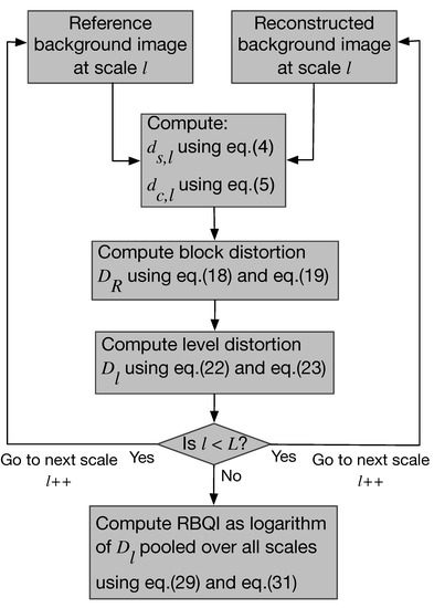 As indicated previously, the reference and reconstructed background images are decomposed each into a multi-scale pyramid with L levels. Structure difference maps and color difference maps are computed at every level as described in Equations (4) and (5), respectively. These difference maps are pooled together within the scale and later across all scales using a probability summation model [55] to give the final RBQI.