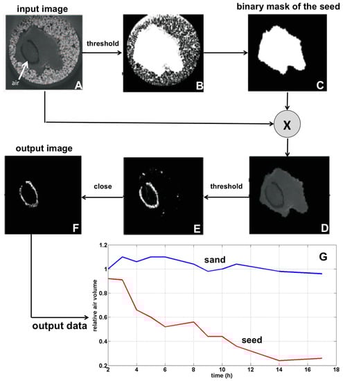 In order to automatically detect the voxels with low intensities identifying the air regions, we devised an image processing pipeline based on the segmentation methodology, applied to the 60 slices of the 3D X-ray image. As is visible in Figure 1B–F, where we show the process on one slice, e.g., 2D for an easier illustration, this is achieved in a two-step process realized by simple thresholdings automatically calculated according to the Otsu method [20]. A first threshold is applied to the image to separate the sand coded in high gray-level intensities from the seed coded in relatively low gray-level intensities (Figure 1B). This serves as a mask (Figure 1C), which is then applied to the original image (Figure 1D). A second threshold is then applied to separate the air in the seed coded in lower gray-level intensities than the rest of the seed coded in higher gray-level intensities (Figure 1E). A particle size filtering by morphological closing [21] is then applied to remove isolated tiny structures composed of less than three voxels (Figure 1F). Thus, the output image delivers pixels corresponding to air in the seed. Considering voxels by stacking all output images, these voxels can be counted to evaluate the air volume remaining in the seed. This can be repeated on images acquired on different dates across the imbibition process, so as to deliver the evolution over time of the remaining volume of air.