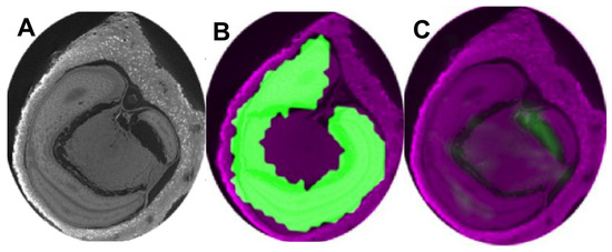 (A) X-ray tomography used as a reference map; (B) registration of MRI lipid-contrasted images (in green) with X-ray tomography (in purple) images; (C) registration of MRI water-contrasted images (in green) with X-ray tomography (in purple) images. We first register the lipid content from the embryo of the dry seed in MRI with the tomography image, as the embryo shape and orientation are recognizable at the spatial resolution of MRI images. After registration, it gives us the transformations we need to apply to water MRI images to be registered with the anatomy of the seed identified by X-ray tomography.