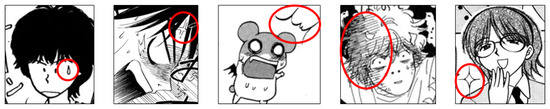 Some examples of “manpu”: a mark used to represent the emotions of the characters such as anger, surprise, embarrassment, confidence, etc. The original images are extracted from the Manga109 dataset [10], ©Yoshi Masako, ©Kobayashi Yuki, ©Arai Satoshi, ©Okuda Momoko, ©Yagami Ken.