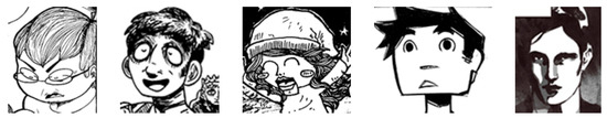 Different examples of comics character faces. Some parts of the face such as the nose, eyes, or mouth can be deformed to emphasize the emotion of the character. The original images are extracted from the BAM! dataset [11].