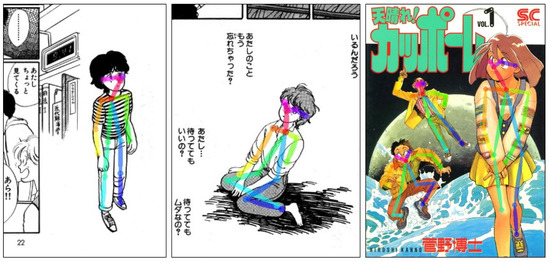 Some examples of Open Pose application on comic pages [27]. This model works well for comics as long as the drawings are realistic, so it fails in most cases. Source: images extracted from the Manga109 dataset [10], ©Yoshi Masako, ©Kanno Hiroshi.