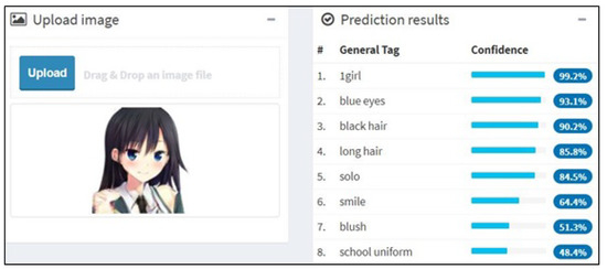 Example application of illustration2vec [42]. The model recognizes several attributes of the character such as her haircut and clothes. The web demo used to generate this image is not online anymore.