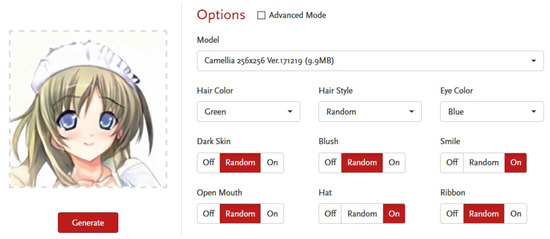 - Jin, Y.; Zhang, J.; Li, M.; Tian, Y.; Zhu, H.; Fang, Z. MakeGirlsMoe. Available online: http://make.girls. moe/#/ (accessed on 25 June 2018).