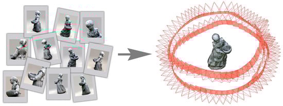 Over the years, a variety of techniques and algorithms for 3D reconstruction has been developed to meet different needs in various fields of application ranging from active methods that require the use of special equipment to capture geometry information (i.e., laser scanners, structured lights, microwaves, ultrasound, etc...) to passive methods that are based on optical imaging techniques only. The latter techniques do not require special devices or equipment and thus are easily applicable in different contexts. Among the passive techniques for 3D reconstruction there is the Structure from Motion (SfM) pipeline [,,,,]. As shown in Figure 1, given a set of images acquired from different observation points, it recovers the pose of the camera for each input image and a three-dimensional reconstruction of the scene in form of a sparse point cloud. After this first sparse reconstruction, it is possible to run a dense reconstruction phase using Multi-View Stereo (MVS) [].