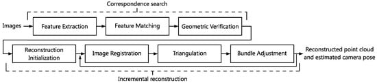The SfM pipeline allows the reconstruction of three-dimensional structures starting from a series of images acquired from different observation points. The complete flow of incremental SfM pipeline operations is shown in Figure 2. In particular, incremental SfM is a sequential pipeline that consists of a first phase of correspondences search between images and a second phase of iterative incremental reconstruction. The correspondence search phase is composed of three sequential steps: Feature Extraction, Feature Matching and Geometric Verification. This phase takes as input the image set and generates as output the so called Scene Graph (or View Graph) that represents relations between geometrically verified images. The iterative reconstruction phase is composed of an initialization step followed by three reconstruction steps: Image Registration, Triangulation and Bundle Adjustment. Using the scene graph, it generates an estimation of the camera pose for each image and a 3D reconstruction as a sparse point cloud.