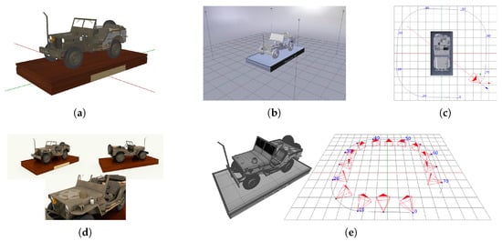Example of synthetic dataset generation steps: (a) 3D model. (b) Scene setup. (c) Camera motion around the object. (d) Images rendering. (e) 3D model geometry and camera pose ground truth export.