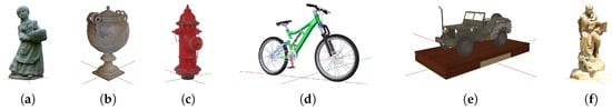 3D models used for synthetic dataset generation and Ignatius ground truth: (a) Statue []. (b) Empire Vase []. (c) Hydrant []. (d) Bicycle []. (e) Jeep []. (f) Ignatius [].