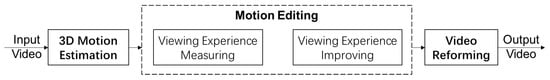 Based on the motion type they are designed for, the video stabilization techniques are classified into 2D [,,,] and 3D solutions [,,,]. In the 2D solutions, the motion on the image plane is estimated using either local features or pixel intensity information. Then, the frame transformation is calculated based on the smoothed 2D motion. In contrast, 3D solutions estimate the camera motion in the 3D world. The estimation approaches mainly rely on the methods of either structure-from-motion (SfM) [] or visual-based simultaneous localization and mapping (vSLAM) []. The advantage of 3D solutions is that they generate a full understanding of the physical camera motions. However, they are usually slower and more fragile than 2D methods, since their motion estimation step is sensitive to the accuracy of feature matching [,,]. The drawback of 2D methods is that they do not have an understanding of the 3D world, so users cannot obtain a real ideal camera path like the ones that 3D methods can provide. As a result, some advanced processes, such as intentional motion preservation, cannot be performed. Also, in most cases, these algorithms would produce severe distortions when the recorded scene cannot be modeled as planar.
