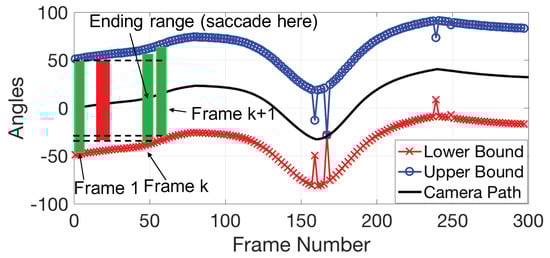 Consider the example in Figure 5. The eye movements of the viewer are modeled as a random process. Suppose the viewer randomly chooses a target to track within the field of view (FOV) from the first frame. The trajectory of this target in Figure 5 is a straight, horizontal line, since it remains at the same object position within a short period with respect to the camera orientation in the first frame. When this line intersects the boundaries (), the viewer can no longer track this target. In this situation, one of two things happens. To keep tracking the same target, the viewer can perform a catch-up saccade. Otherwise, a saccade eye movement is performed to randomly retarget a new object within the FOV. Either of these two procedures takes time, nearly 6 frames [].