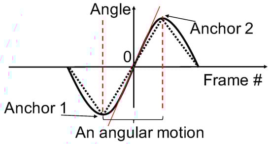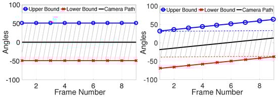 Equations (15) and (16) are conditions on , the angular position of the target at frame k. Solving them for each frame and for each type of motion (yaw, pitch, or roll) gives us an interval of . Any object in the current frame that has an angular position within this interval can be tracked without having a catch-up saccade between the next two frames if the SPEM has already been performed. We defined this interval as  for future convenience.  contains all the information we need to compute the viewing experience of FPVs.