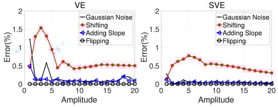 We assumed that the resolution of the video of the synthetic motion was 1080p, the viewing distance was 3240 and the focal length was 830. The errors of the VE and SVE scores are shown in Figure 15. From Figure 15, we can see that our two measurements, VE and SVE, are both robust under the different operations. There were three main observations. Firstly, the flipping operation does not influence the scores at all, as expected. Secondly, VE and SVE have similar performances when the motion amplitude is large. Meanwhile, they are more robust at a high amplitude than at a low amplitude. Intuitively, this is not only because the same noise magnitude is smaller relative to the larger amplitude, but also because larger amplitude creates a shakier video, so it is harder for viewers to distinguish the difference between similar motions. Thirdly, VE is a more sensitive measure since it has larger changes under noise, especially in the low amplitude region where the FPF increases dramatically according to Figure 9b. We prefer a measurement that has a higher sensitivity while being robust enough. This is supported by the tests in the next section.