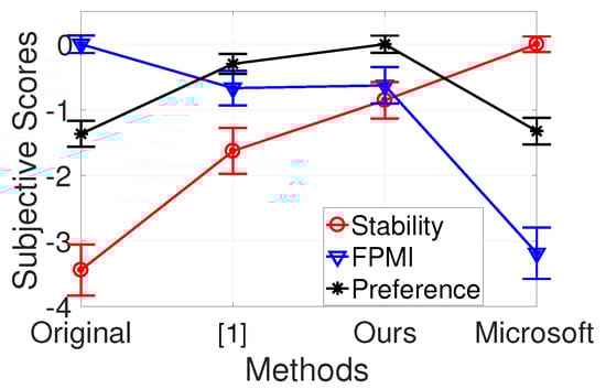 Our test used a paired comparison and included 21 subjects. Subjects were asked the following questions after being shown each pair: (1) Which video is more stable; (2) In which video you can recognize more First-Person motion; (3) If your friend tries to share his/her First-person experience with you, which one do you prefer. The subjective scores (with 95% confidence interval) calculated using the Bradley–Terry model [] are shown in Figure 16, which also includes the result from our earlier work []. A higher score indicates higher stability, more FPMI, or higher preference.