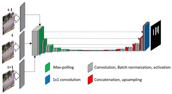 Compared to the state-of-the-art techniques [5,30,31] where they usually use a pre-trained VGG network [24], we designed our own network and initialized the parameters using the strategy of [42]. The input to our network is a set of three frames at three different time instants i.e., , t and . Segmentation is performed for the frame at time instant t. The frames at time instant and only provide temporal information and assist the segmentation. The output of our decoder network is a single channel binary mask of the frame at time instant t where pixels correspond to the pedestrians are marked white. The loss of the network is defined by applying convolution with sigmoid activation. Let us assume that P is the predicted mask and G is the groundtruth, the binary cross entropy, and dice coefficient loss between the two binary images is calculated as the following:
