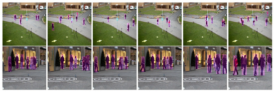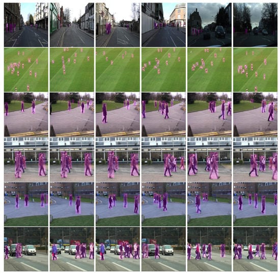 Qualitative results of our PedNet on 8 Challenging datasets. The row 1, 5, and 7 shows Pets2009 [36] dataset that is the commonly used for tracking. Second, sixth and the eighth row corresponds to TUD [37,38] dataset which is also used for evaluating tracking algorithms. The third row shows CamVid [39] dataset which is used for segmentation. The fourth row shows AFL [40] dataset which is used for tracking sports player.
