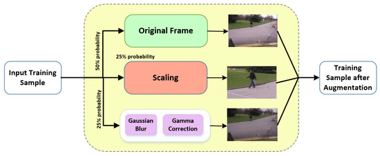 While training the network, the samples are randomly selected from the training set. With 50% probability, the original training sample is used for training. With the other 50% probability, it can go through two types of augmentation i.e., either scaling of light intensity variation. Scaling is introduced by cropping a random region in the original frame. While light intensity variation, first Gaussian blur is applied and then gamma correction is used.