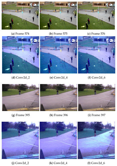The first column shows the original frames of Pets2009 S2L1 View 1 [36] dataset. The 2nd column corresponds to the activation of Conv2d_2 for frame at , Conv2d_4 for frame at t, and Conv2d_6 for frame at t. The third and fourth column shows the original frame of Pets2009 S2L1 View 7 [36] dataset and their corresponding activation. The layers Conv2d_2, Conv2d_4, and Conv2d_6 learned different features during training, therefore, their response is different.