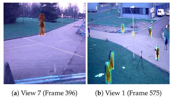 To justify our claim regarding the temporal information, we visualized the activation of different layers of the network. Technically, the layers of the network should learn different information in order to extract discriminative features from each frame. We focused mainly on the convolution layers Conv2d_2, Conv2d_4, and Conv2d_6. It is because these are the first convolutions in the encoder network. After these convolutions, the feature maps are fused and it is not possible to differentiate the frames at , t, and . We used Grad-CAM [43] to get the maximum activation of the layer. In Figure 5d,j corresponds to the activation of frame at . Similarly, Figure 5e,k gives the activation at time t and Figure 5f,l is related to activation at . It is obvious from the figures that the activations are different from each other. Especially, the RGB value response is different which is also proved by [22] that the first layers learn mainly the color features. Given that the network layer learned different features, we can infer that it is extracting different information from the frame at , t, and . In the subsequent layers, the network fuses the features maps of the input frames and implicitly exploit the encoded temporal information for segmentation. We also visualized the last layer of the network before the 1 × 1 convolution which shows the response of the network in the region related to the pedestrian Figure 6.
