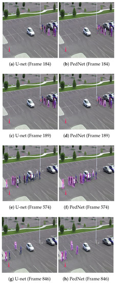 To show the effectiveness of our proposed PedNet, we trained U-net [5] on our own dataset. U-net has a very similar architecture to PedNet but does not use multi-frames for segmentation. We tested U-net and PedNet on the parking-lot [44,45] dataset. The parking-lot dataset was not included in the training set of either network. The Figure 7 show example frames where PedNet performs well and U-net fails to segment regions corresponds to the pedestrian.