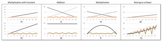 Figure 1a shows the propagation of uncertainty through a constant multiplication. The input signal (gray) is multiplied by 2. As a result, the input signal and its uncertainty are transformed as Equation (2) shows. Figure 1b shows the transformed signal as well as the resulting uncertainty.