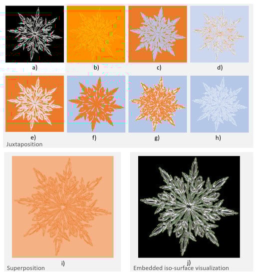 Multi-variate visualization [] can be accomplished for all possible kinds of data. Volume rendering [,,] utilizing specific transfer functions to visually encode multiple values and their similarities per grid are widely used. Although these techniques offer a suitable volume visualization for multi-variate volume datasets, they can lead to visual clutter. To solve this problem, the presented technique utilizes an iso-surface based visualization that is embedded into the original image.
