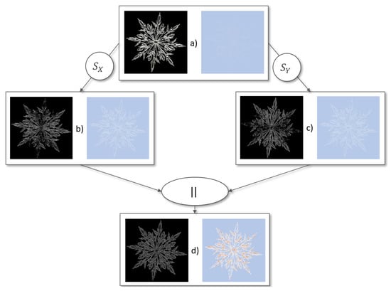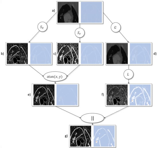 In this example, two edge detection algorithms where combined. First, the Sobel edge detection was utilized. Figure 8b,c show the application of the Sobel kernel in x and y direction. After that, they are combined utilizing the length of vector function in Figure 8. On the other hand, a Gaussian smoothing was applied to the original image Figure 8d. After that, the Laplace edge detection was applied Figure 8f. Finally, both edge detection results are combined utilizing the length of vector function Figure 8g.