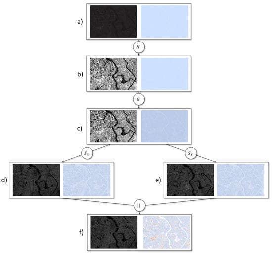 Uncertainty-aware image pre-processing applied to a satellite image of Tokyo. (a) Input image; (b) Contrast equalization; (c) Gaussian Smoothing; (d) Sobel operator in x-direction; (e) Sobel operator in y-direction; (f) Length of vector.