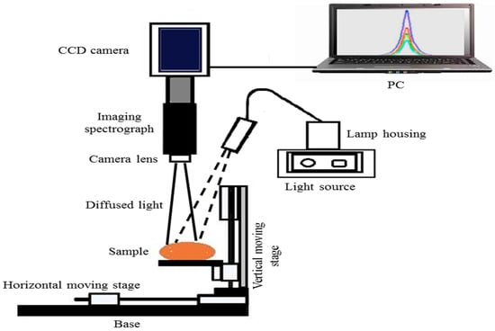 The main target of using a hyperspectral imaging system (HSI) system in this study was to capture the diffuse scattered light in the range of 400–1000 nm under the reflection mode for whole tubers. The system, as shown in Figure 2, contained a Hamamatsu dual mode cooled CCD camera (model No. C4880, Hamamatsu Photonics, Hamamatsu, Japan), an imaging spectrograph directly attached to the CCD camera (ImSpector V10, Spectral Imaging Ltd., Oulu, Finland), a power supply control (model No. 69931, Oriel Instruments Irvine, CA, United States), a digital exposure controller (model No. 68945, Oriel Instruments, Irvine, CA, United States), and a light source (model No. 66881, Oriel Instruments, Irvine, CA, United States) holding a 250 W Quartz Tungsten Halogen lamp and having a lens material transmittance range of 350–2500 nm. A fiber optic cable coupled with a lens focusing assembly was used to deliver a broadband light beam of 1.5 mm diameter, making a 15° angle away from the vertical axis and 1.6 mm apart from the scanning line. The sample holder movement was controlled using a step motor, and each sample was scanned 10 times with a distance of 1 mm between two successive scans, which totally covered the 9 mm longitudinal distance along the sample. The acquisition time was adjusted for each sample at 200 ms, so the total scanning time for each scanning was 2 s. At each scanning line, the spectrograph acquired the spectral information represented by a 256 × 256 pixel image, with spatial and spectral resolutions of 0.2 mm/pixel and 2.35 nm, respectively.