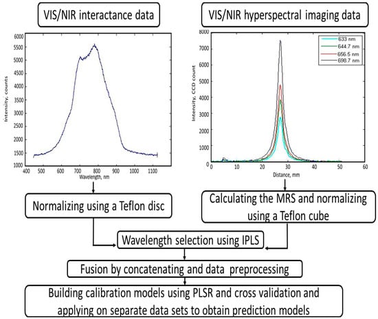 Partial least squares regression (PLSR) was applied on the fused data to build calibration and prediction models. PLSR is a linear regression technique known for handling high dimensional data and overcoming the colinearity problem associated with such types of data [46].