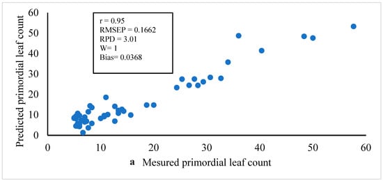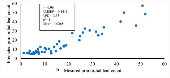 On the other side, the best PLSR calibration and prediction models of primordial leaf count for FL1879 and R.Norkotah cultivars are shown in Table 4. The optimal models are shown in the shaded cells. In the case of FL1879, the values of r(RPD) of prediction models were 0.95(3.01), 0.91(2.27), and 0.91(2.49) for W = 1, 2, and 3, respectively. Whereas, in the case of R.Norkotah, the r(RPD) values were 0.96(3.55), 0.95(3.24), and 0.94(2.93), for W = 1, 2, and 3, respectively. The spectral preprocessing methods for the optimal models were first derivative and MSC for FL1879, and second derivative and mean center for R.Burbank. However, the preprocessing of the LC values for the same models was power transformation. The relationship between the measured and predicted LC values for FL1879 and R.Norkotah deduced from the optimal prediction models for W = 1 is shown in Figure 4a,b.