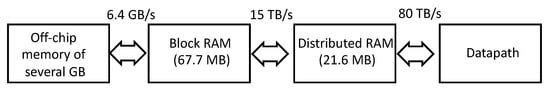Bandwidth/memory distribution in Xilinx Virtex-7 FPGA which highlight how bandwidth and computation improves as we near the datapath parts of the FPGA.