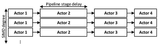 Data-level parallelism directly impacts the system performance; the major limiting factor is the number of resources available on FPGA. An example pipeline structure with an algorithm composed of four actors each having different execution times, and multiple instances of the algorithm realised in SIMD fashion is shown in Figure 2. The performance metric, frames-per-second (fps) can be approximated using the number of pixels in a frame, the number of pixels consumed by an actor in each iteration and is operating frequency of processor.