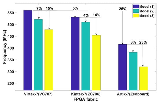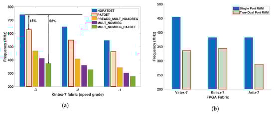 Figure 4 presents the impact of different configurations of DSP48E1 and BRAM on and the parameters required by the developed C-APIs running on the host CPU using different FPGAs. The DSP48E1 has five configurations that offer different functionalities (multiplier, accumulator, pre-adder and pattern detector) based on different internal pipeline configurations that directly impacts . It varies 15–52% for the same speed grade and reduces by 12–20% when the same design is ported from −3 to −1 speed grade. Configuring the BRAM as a single and true-dual port RAM, Figure 4b has been created to show that a true-dual port RAM configuration gives a reduction of 25% in . However an improvement of 16% is possible by migrating the design from Artix-7 to Kintex-7 FPGA technology.