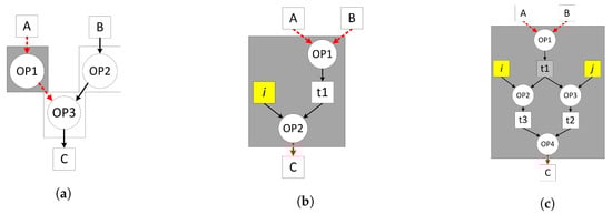 A range of dataflow models taken from [24,25]. (a) DFG node without internal storage called configuration ①; (b) DFG actor without internal storage t1 and constant i called configuration ②; (c) Programmable DFG actor with internal storage t1, t2 and t3 and constants i and j called configuration ③.