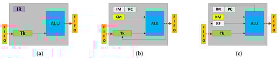 FPGA datapath models resulting from Figure 5. (a) Programmable ALU corresponding to configuration ①; (b) Fine-grained processor corresponding to configuration ②; (c) Coarse-grained processor corresponding to configuration ③.