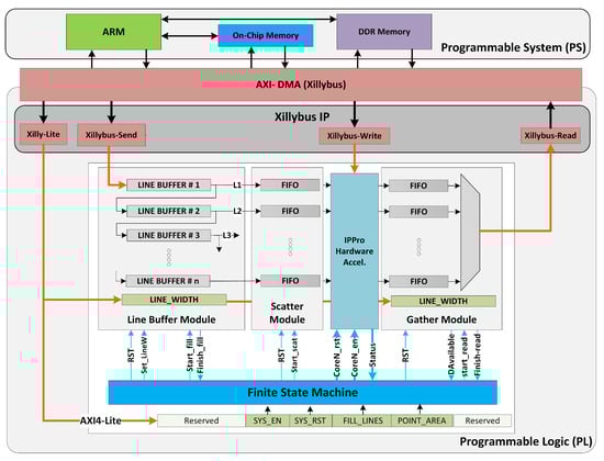 Figure 9 shows the implemented system architecture which consists of the necessary control and data infrastructure. The data interfaces involve stream (Xillybus-Send and Xillybus-Read); uni-directional memory mapped (Xillybus-Write) to program the IPPro cores; and Xillybus-Lite to manage Line buffer, scatter, gather, IPPro cores and the FSM. Xillybus Linux device drivers are used to access each of these data and control interfaces. An additional layer of C functions is developed using Xillybus device drivers to configure and manage the system architecture, program IPPro cores and exchange pixels between PS and PL.