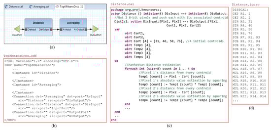High-level implementation of k-means clustering algorithm: (a) Graphical view of Orcc dataflow network; (b) Part of dataflow network including the connections; (c) Part of Distance.cal file showing distance calculation in RVC-CAL where two pixels are received through an input FIFO channel, processed and sent to an output FIFO channel; (d) Compiled IPPro assembly code of Distance.cal.