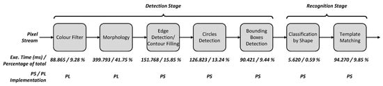 Traffic sign recognition is applied in driver assistance systems [29]. In the detection stage, sign candidate areas are extracted from the original image and matched against a list of known templates in the recognition stage. The processing stages along with their execution time and percentage contribution to the overall execution time for 600 × 400 image sign recognition implemented on ARM Cortex-A9 are shown in Figure 12. It involves a colour filter to convert RGB to HSV, morphology filters (erosion and dilation) using 3 × 3 and 5 × 5 circular kernels, edge detection, circles detection to guide the matching process and reduce the number of shapes, bounding box detection to transform the remaining objects into their convex hulls, classification by shape and then template matching. The colour and morphology filters have been chosen for hardware acceleration as they are dominant processing components as shown in Figure 12.