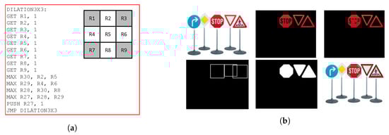 (a) The simplified IPPro assembly code of 3 × 3 dilation operation. (b) The output result of implemented design.