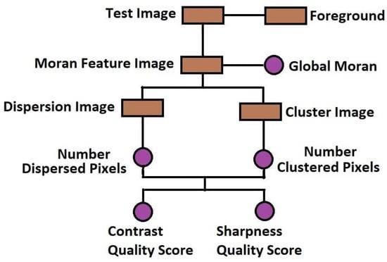 - Step 4: Quality PredictionQuality prediction is based on two concepts. First, the GMS is considered a perceptual weight which modulates the LMS. Second, the test image is a real grayscale image having heterogeneous features, that is, images in which pixels can be assigned to at least two different classes. In contrast, sharpness and total quality scores shown in Figure 2h are predicted from the perceptually weighted sum of the clustered and dispersed pixels within a grayscale image.The contrast quality score is defined as:The sharpness quality score is defined as:The total quality score is the average of the contrast and sharpness quality scores:Here, we show how the quality scores defined in Equations (7) and (8) can predict the contrast and sharpness quality scores of an ideal, extremely degraded and real MRI slices.