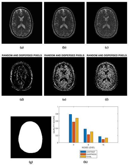 The implementation of blind noise-based quality assessment in MRI images. (a) The test image provided by NeuroRx Research Inc. (b) Degraded version of the test image in (a) at 8 percent Rician noise. (c) Degraded version of the test image in (a) at 16 percent Rician noise. (d) Random and dispersed pixels in the test image in the absence of noise distortion. (e) Random and dispersed pixels in the test image at 8 percent Rician noise. (f) Random and dispersed pixels in the test image at 16 percent Rician noise. (g) The Foreground extracted from the test image in (a). (h) Variation of contrast, sharpness and total quality scores at Rician noise levels of 0 percent, 8 percent and 16 percent.