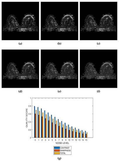 (a) A breast MRI slice provided by the RIDER project of The Cancer Imaging Archive (TCIA) and its degraded versions at Rician noise levels (b) 3 percent, (c) 6 percent, (d) 9 percent, (e) 12 percent and (f) 15 percent. (g) Variation of contrast, sharpness and total quality scores for Rician noise levels that vary from 0 percent to 15 percent.