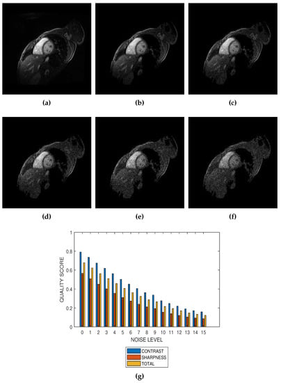 (a) A short axis cardiac MRI slice provided by the Department of Diagnostic Imaging of the Hospital for Sick Children in Toronto, Canada, and its degraded versions at Rician noise levels (b) 3 percent, (c) 6 percent, (d) 9 percent, (e) 12 percent and (f) 15 percent. (g) Variation of contrast, sharpness and total quality scores for Rician noise levels that vary from 0 percent to 15 percent.