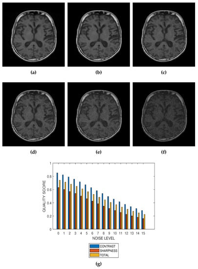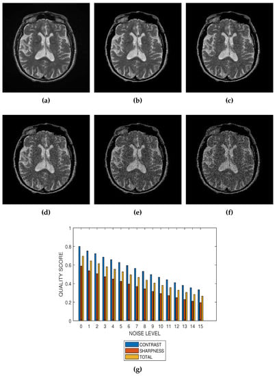 (a) A conventional T1 weighted MRI slice from BrainCare Oy., and its degraded versions at Rician noise levels (b) 3 percent, (c) 6 percent, (d) 9 percent, (e) 12 percent and (f) 15 percent. (g) Variation of contrast, sharpness and total quality scores for Rician noise levels that vary from 0 percent to 15 percent.