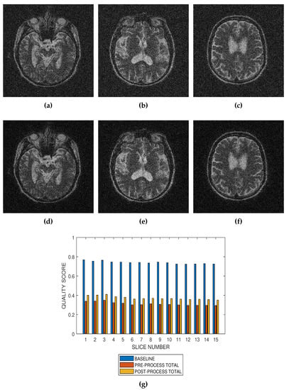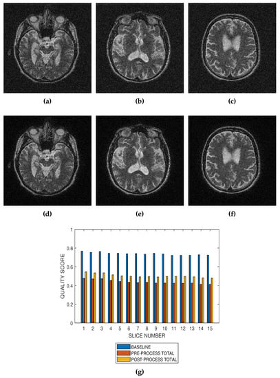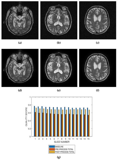 Application of the proposed method to the assessment of an image enhancement algorithm. (a–c) are slices numbers 20, 27 and 34, respectively in a T2 MRI volume degraded with 12 percent Rician noise. (d–f) are the slices displayed in (a–c) but their quality have been enhanced using a bilateral filter. (g) The baseline quality score of the original image, the predicted total quality indices of 12 successive T2 MRI slices in a volume data before and after enhancement with a bilateral filter.