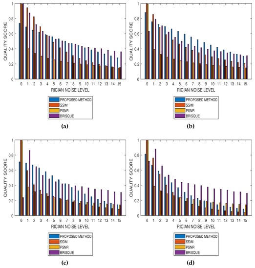 Results from comparative performance evaluation of the proposed method with SSIM, PSNR and BRISQUE are displayed in Figure 10 and Figure 11, for real and simulated MRI data, respectively. Figure 10a–d are quality predictions on T2, T1, breast and cardiac MRI slices for Rician noise levels from 0 to 15. The images in the first, second and third columns of Figure 11 are sample MRI images from simulated T1, T2 and PD MRI volume data. Quality predictions corresponding to each MRI volume data, for Rician noise levels from 0 to 15, are the plots in the last row of Figure 11. For all the quality metrics, there is a general trend of decreasing quality score with increasing noise level. Table 1, Table 2, Table 3 and Table 4 are the subjective evaluation results from the comparative performance of our proposed method with SSIM, PSNR and BRISQUE quality metrics.